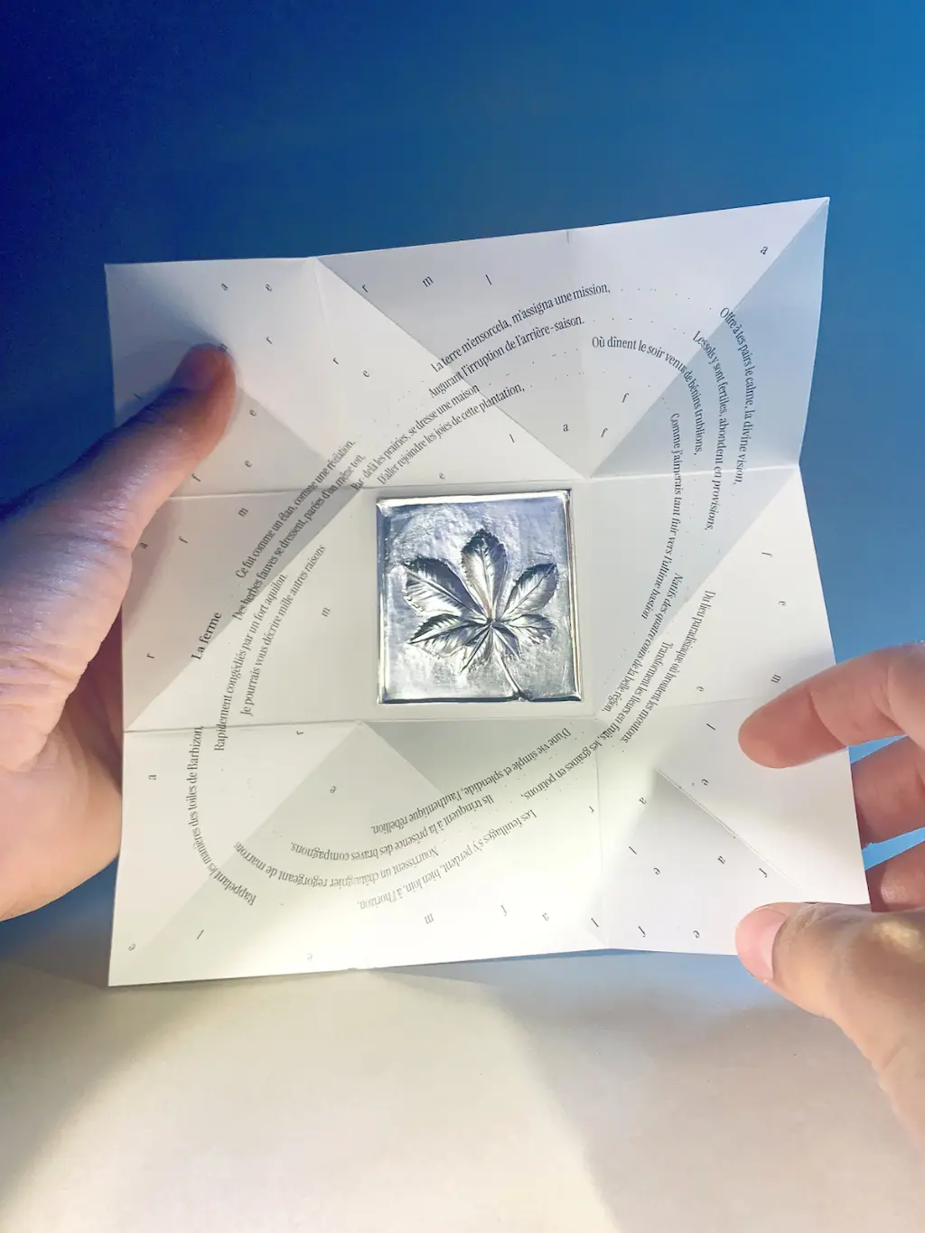Ce poème est disponible à la vente sous la forme d’un origami. Une fois reçu, déployez une à une les ailes de cette petite bourse de papier et voyez apparaître les vers du poème ‘La ferme’ ainsi qu’un petit bas-relief repoussé à la main dans une fine feuille d’aluminium.