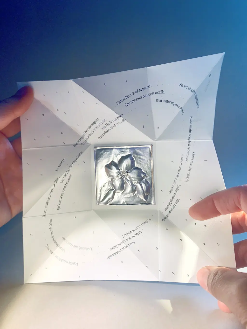 Ce poème est disponible à la vente sous la forme d’un origami. Une fois reçu, déployez une à une les ailes de cette petite bourse de papier et voyez apparaître les vers du poème ‘Le ventre’ ainsi qu’un petit bas-relief repoussé à la main dans une fine feuille d’aluminium.