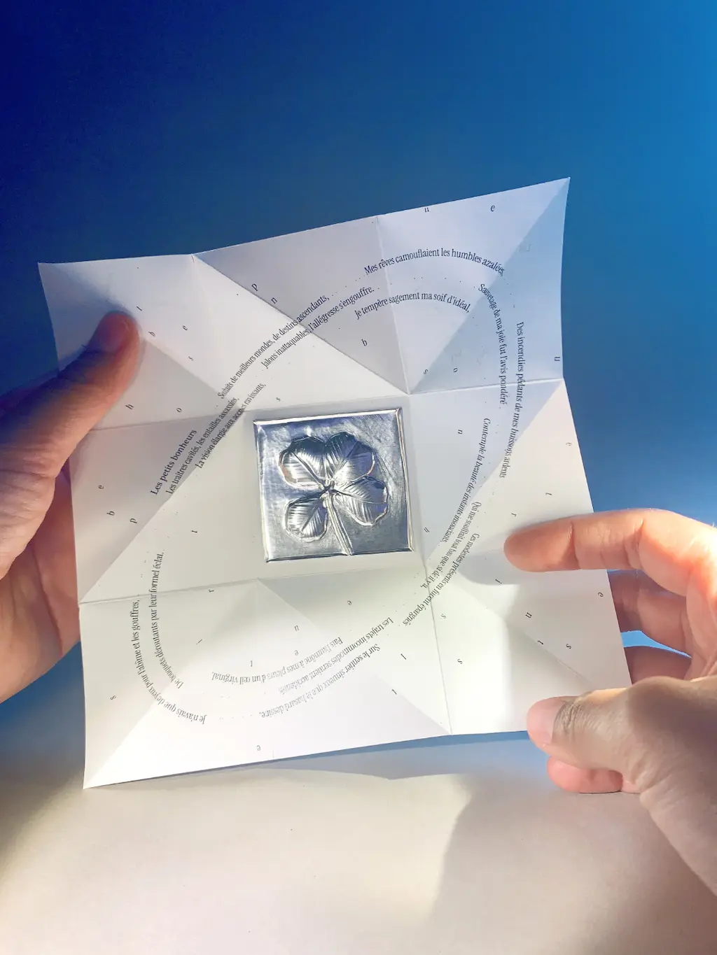 Ce poème est disponible à la vente sous la forme d’un origami. Une fois reçu, déployez une à une les ailes de cette petite bourse de papier et voyez apparaître les vers du poème ‘Les petits bonheurs’ ainsi qu’un petit bas-relief repoussé à la main dans une fine feuille d’aluminium.